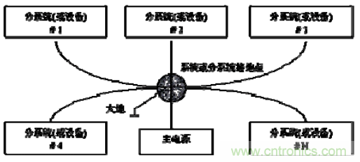 單點接地要求每個電路只接地一次,并且接在同一點,并設置一個安全接地螺栓,防止來自兩個不同子系統( 有不同的參考電平) 中的電流與射頻電流經過同樣的返回路徑,從而導致共阻抗耦合。
