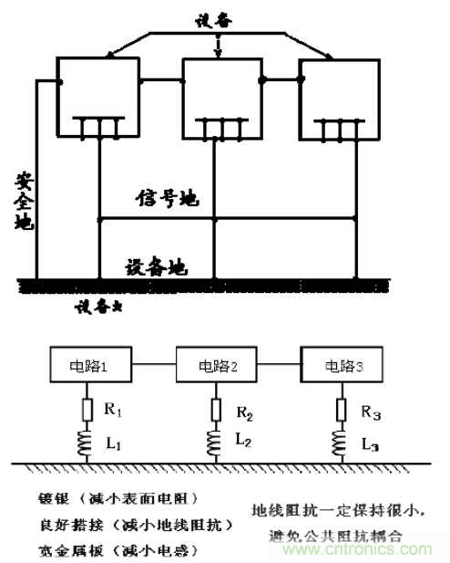 多點接地時容易產生公共阻抗耦合問題。在低頻的場合,通過單點接地可以解決這個問題。但在高頻時,只能通過減小地線阻抗(減小公共阻抗)來解決。在導體表面鍍銀能夠降低導體的電阻,如圖所示。