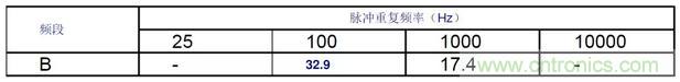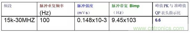 由表可知,峰值測(cè)量結(jié)果≥準(zhǔn)峰值測(cè)量結(jié)果。下表中中列出了輸入標(biāo)準(zhǔn)脈沖,在標(biāo)準(zhǔn)寬帶情況下峰值與準(zhǔn)峰值表頭指示之比值。峰值測(cè)量時(shí)的絕對(duì)脈沖特性