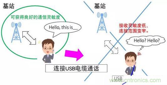 通常,對于從數字基板直接進入天線的噪聲會有相應的對策,但是由于智能手機中連接了USB等接口電纜,該電纜成為了放射源,導致進入天線的噪聲增加從而使接收靈敏度降低。