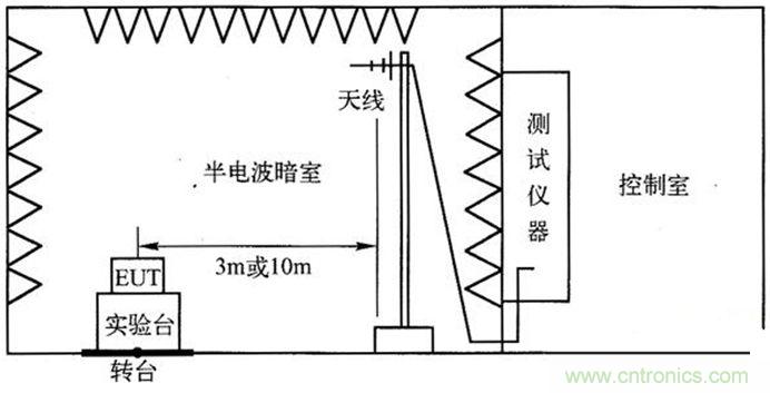 圖1所示是根據(jù)CISPR16、CISPR11、CISPR13、CISPR15、CISPR22及EN55022等標(biāo)準(zhǔn)要求的輻射發(fā)射測試布置圖,輻射發(fā)射測試時,被測設(shè)備(EUT)置于半電波暗室內(nèi)部,在轉(zhuǎn)臺上旋轉(zhuǎn),在接收天線分別處于垂直極化和水平極化的情況下,找到最大的輻射點。輻射信號由接收天線接收后,通過電纜傳到半電波暗室外的接收機(jī)。