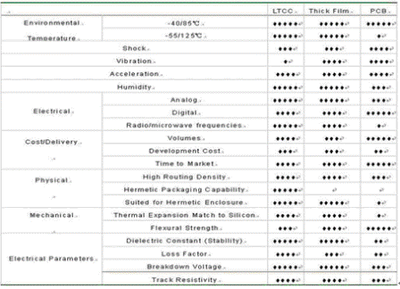 與其它集成技術相比,LTCC具有以下特點: