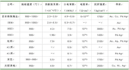 表3一些公司的低溫共燒介質材料性能