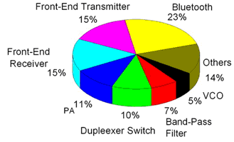 LTCC器件按其所包含的元件數量和在電路中的作用,大體可分為LTCC元件、LTCC功能器件、LTCC封裝基板和LTCC模塊基板。LTCC屬于高新科技的前沿產品,廣泛應用于微電子工業的各個領域,具有十分廣闊的應用市場和發展前景。目前LTCC 技術已經進入更新的應用階段,包括無線區域網絡、地面數位廣播、全球定位系統接收器組件、數位信號處理器和記憶體等及其他電源供應組件甚至是數位電路組件基板。例如,村田、三菱電工、京瓷、TDK、Epcos、日立、Avx等十多家開發的手機無線開關組件,NEC、村田和和易利信等開發的藍牙組件都是由LTCC技術制成的。此外,LTCC組件因其結構緊湊,高耐熱和耐沖擊性,目前在軍工和航天設備中廣泛應用,預計未來在汽車電子系統上的應用也會非常普遍。CTS 公司已經宣布將為汽車電子市場提供低溫燒結陶瓷(LTCC)電路板。圖6為目前LTCC器件應用領域所占比例。