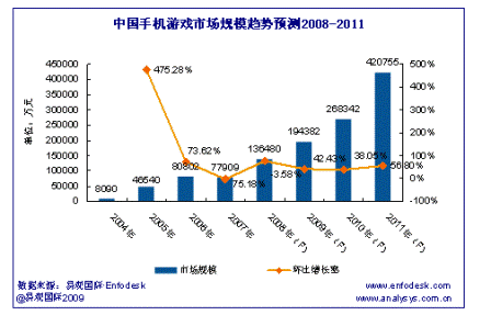 據(jù)易觀國際(Analysys International)最新報告《中國手機游戲市場趨勢預測2008-2011》研究結(jié)果顯示:2011年中國手機游戲(本文手機游戲范疇均為基于JAVA和BREW技術(shù)開發(fā)的手機游戲)市場規(guī)模將達到42億元,從2003年到2011年的手機游戲市場規(guī)模年均復合增長率為147.90%。其中移動運營商收入從2003年到2011年年均復合增長率將達143.26%,手機游戲SP收入從2003年到2011年年均復合增長率將達348.01%。手機游戲SP高復合增長率主要由自身對手機聯(lián)網(wǎng)游戲產(chǎn)品的推動、用戶對休閑娛樂應用需求的增長、3G網(wǎng)絡商用等因素所帶動。