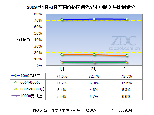 從1月到3月的關(guān)注走勢來看,6000元以下筆記本的關(guān)注度遙遙領(lǐng)先,關(guān)注比例保持在70%以上,并且呈現(xiàn)出上升的態(tài)勢。6001-8000元產(chǎn)品的關(guān)注度出現(xiàn)下滑,8001-10000元、10000元以上產(chǎn)品的關(guān)注度變化不大。