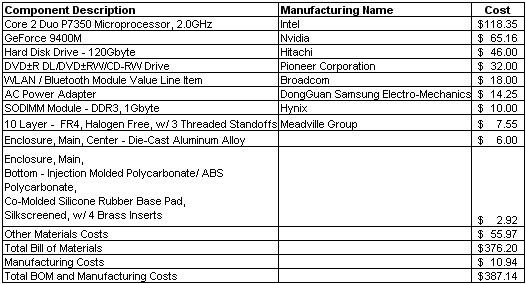 這種新一代Mac Mini的入門級版本的材料成本是376.20美元,如果計入制造成本,則總成本升至387.14美元。這種低端型號的Mac Mini價格是599美元,這表明與蘋果公司的iPod產(chǎn)品等低成本消費產(chǎn)品相比,其個人電腦的材料成本/制造利潤相對較低。