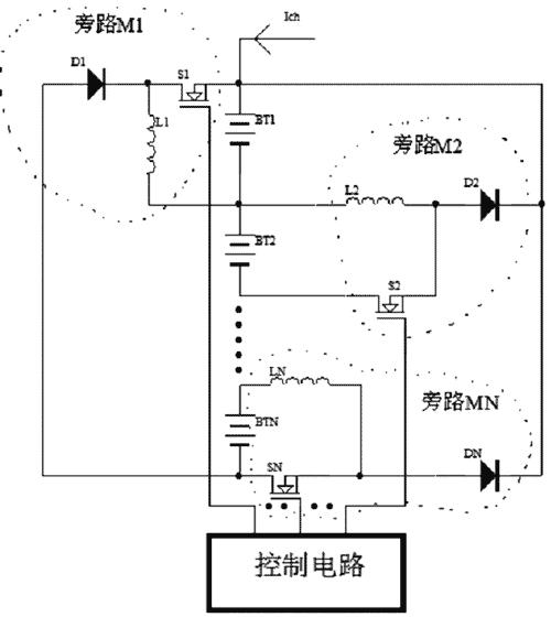 4.運(yùn)用分時原理,通過開關(guān)組件的控制和切換,使額外的電流流入電壓相對較低的電池中以達(dá)到均衡充電的目的。該方法效率比較高,但控制比較復(fù)雜。