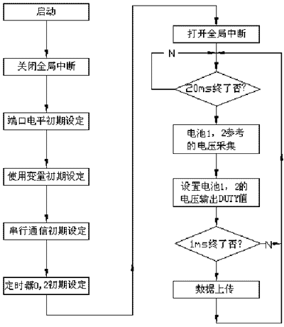 為了驗(yàn)證本文的均衡充電方法,以兩節(jié)單體電池組成的蓄電池組為例進(jìn)行實(shí)驗(yàn)和分析,主要驗(yàn)證旁路中開關(guān)管對電壓的調(diào)節(jié)作用。控制流程見圖4。
