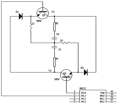 本實(shí)驗(yàn)中,選用兩個小功率NPN管C1815(Q1、Q2)來替代開關(guān)管,用89C51芯片的P1.0和P1.1腳控制Q1、Q2的開關(guān)。同時,蓄電池的端電壓V1和V2由差動放大電路采集,經(jīng)A/D轉(zhuǎn)換送到CPU。在整個過程中,電壓每20ms采樣一次,每隔1s上傳上位機(jī)并保存并自動繪制曲線。圖5為試驗(yàn)電路圖。