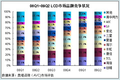T6陣營(TCL、創(chuàng)維、海爾、海信、長虹、康佳)在2008年,借助“奧運攻勢”等活動發(fā)力,并通過產品線的不斷更新定義,終端渠道的投入及價格戰(zhàn)等逐步確立主導地位。但由于受面板價格上升及缺貨的影響,2009年二季度國內品牌市場地位容易下滑,S3(三星、索尼、夏普)挾技術及面板資源攻守兼?zhèn)洌瑫rLG、冠捷、清華同方品牌也正發(fā)力提升LCD電視市場銷售,市場競爭愈加激烈。