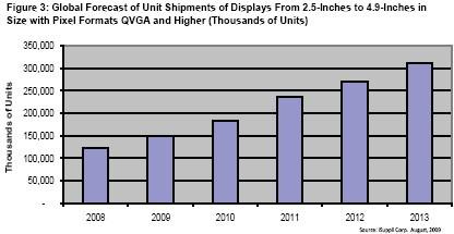 下圖所示為iSuppli公司對對角尺寸介于2.5英寸及4.9英寸之間、像素格式為QVGA及更高的LCD顯示屏全球出貨量的預測。