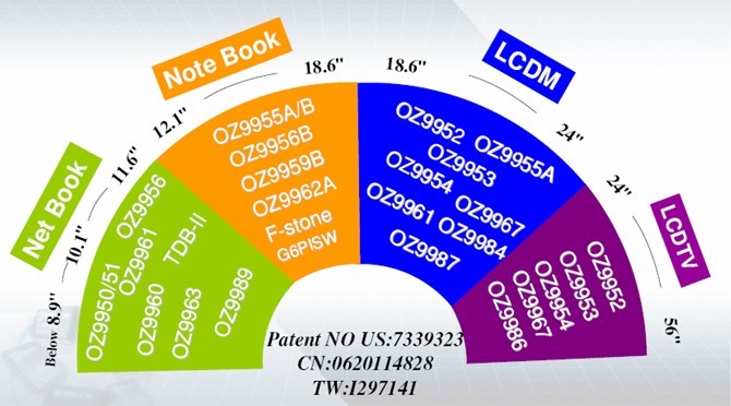 基于這樣的技術積累,目前凹凸科技已成為擁有最廣泛LCD背光驅動IC產品線的廠商,如圖1所示,從上網本到筆記本電腦再到LCD顯示器模塊、LCD TV,尺寸從8.9吋橫跨到56吋,凹凸科技能提供滿足各類應用需的相應LED驅動器解決方案(具備不同的效率等級、PWM接口、不同通道數),包括3x9、4x7、4x8、6x10、8x8、8x9等不同配置。多種技術特性如集成高速PWM功能、采用快速切換的開關模式、突波模式與相移技術,及其專有的區域照明等技術,則可幫助開發人員解決多串數LED均流、LED線性調光所產生的噪聲、功率耗散,以及廠商對于保護規格要求不一等挑戰。