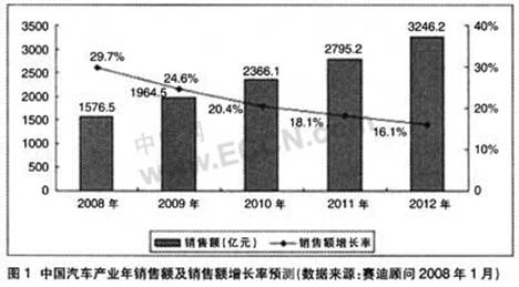 中國汽車產業的繁榮直接帶動了汽車電子產業的迅速崛起。中國汽車產業近幾年快速發展,2007年產量達到近888.24萬部,僅次于日本和美國,成為世界第三大汽車生產國。下游應用市場的快速增長對汽車電子產業的發展起到巨大的推動作用。