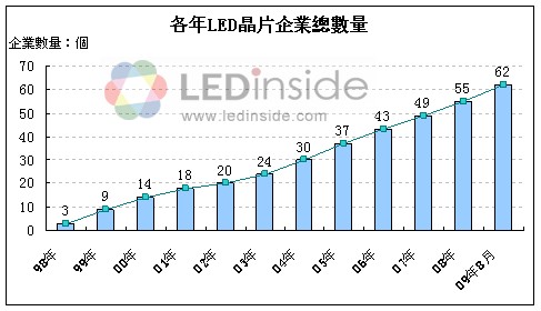 - 至2009年8月現(xiàn)存LED芯片生產(chǎn)企業(yè)達(dá)62個