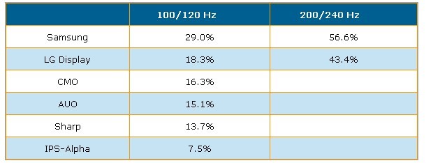 根據DisplaySearch調查指出,第二季全球采用倍頻及雙倍頻掃描技術液晶電視面板出貨達到640萬片,出貨量市占率達18.3%,較上一季提高2%。以廠商別來看,Samsung以29%市占率居100/120Hz出貨量排名冠軍,LG Display以18.3%是占率居次,CMO(奇美)、AUO(友達)、Sharp與IPS-Alpha分居第三到六名。在雙倍頻面板出貨量方面,主要為韓國二家面板廠商所主導,市占率如表二所示。