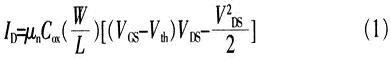 設置柵極寬度為W,有效柵極長度為L,柵極下氧化層的厚度為tOX。MOS管的特性方程為: