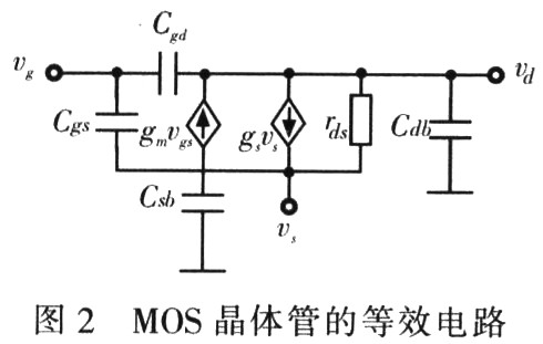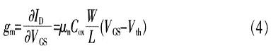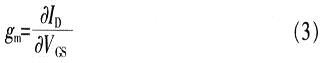 通過式(2)得到如圖2所示的MOS晶體管等效電路,其中壓控電流源gmVgs是模型中最重要的部分,晶體管的跨導gm定義為: