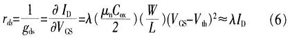 式中,γ是體效應參數,|2φF|為表面反轉電勢。圖2中,電阻rds表示有限輸出阻抗,模擬溝道長度調節和漏極電流因Vds改變而引起的效應,由式(1)可得: