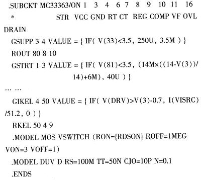 語句GSUPP34VALUE={IF(V(33)<3.5,250U,3.5M)},表示節點33和節點3、4之間連接的模塊實現當輸入端33節點的電壓小于3.5V時,輸出端節點3和節點4之間的電壓為250μF,否則為3.5mV。該網格表使用到的EVALUE和GVALUE器件是將輸出量和輸入量之間運算函數關系用語句表示。EVALUE和GVALUE稱為模擬行為模型(ABM)器件,除了這兩個外還有:*SUM、*MULT、*TABLE、ABS、LOG等,帶有“*”符號的元器件,有E、G兩種類型。使用ABM器件可省去實現這些換算的電路,簡化子電路建模的工作量。
