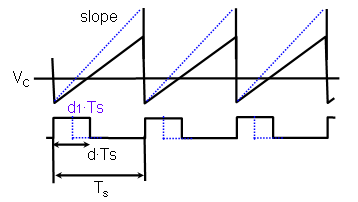 對于輸入電壓的變化,目前通常采用輸入電壓前饋技術(shù),來提高系統(tǒng)對輸入電壓變化的響應(yīng)。輸入電壓前饋如圖3所示。圖中的實(shí)線鋸齒波為內(nèi)部時鐘信號產(chǎn)生的斜率固定為k的正常鋸齒波,在沒有電壓前饋時,產(chǎn)生的占空比為d*Ts,則有以下公式: