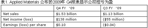 Applied Materials 近日公布的09年第4季財報顯示公司已扭虧為盈,凈收入實現1.38億美元,而上季虧損為5500萬美元。其Q4銷售額為15.3億美元,其中半導體設備銷售占6.56億美元,公司同時已收到了6.29億美元的半導體設備新訂單。