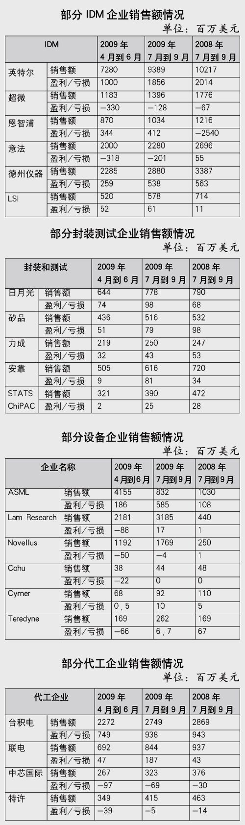 國際金融危機(jī)重創(chuàng)半導(dǎo)體業(yè)。今年第一季度企業(yè)產(chǎn)能利用率普遍在50%以下。進(jìn)入第二季度后,我們看到部分企業(yè)業(yè)務(wù)止跌回升。近日,企業(yè)第三季度財(cái)報(bào)紛紛出籠,產(chǎn)業(yè)好轉(zhuǎn)趨勢進(jìn)一步明朗化。但由于企業(yè)上升動(dòng)力不足,產(chǎn)業(yè)出現(xiàn)“V型”反彈的可能性不大,應(yīng)該會(huì)在振蕩中上升。與此同時(shí),今年半導(dǎo)體業(yè)銷售額同比下降約15%的狀況已確定無疑。業(yè)內(nèi)目前關(guān)注明年產(chǎn)業(yè)上升的幅度。