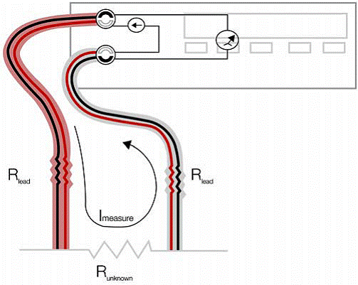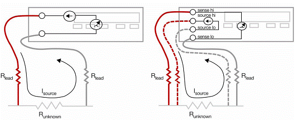 源端引線中的串聯(lián)電阻不影響電流流動。測量/傳感引線幾乎沒有電流流動,因為儀表的輸入阻抗很高。這意味著測量引線中沒有IxR電壓下跌。因此,您只需測量由于流經(jīng)的源電流而在未知電阻器中產生的電壓下跌。