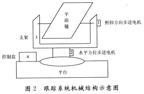 本文介紹的是一種基于單片機(jī)控制的雙軸太陽(yáng)自動(dòng)跟蹤系統(tǒng),系統(tǒng)主要由平面鏡反光裝置、調(diào)整執(zhí)行機(jī)構(gòu)、控制電路、方位限位電路等部分組成。跟蹤系統(tǒng)電路控制結(jié)構(gòu)框圖如圖1所示,系統(tǒng)機(jī)械結(jié)構(gòu)示意圖如圖2所示。