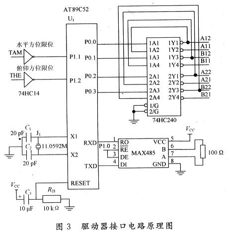 跟蹤系統(tǒng)中微處理器選用89系列性價(jià)比高和功耗低的89C52。74HC14芯片是6非門(mén)施密特觸發(fā)器,與P1.1和P1.2口相連,控制方位限位信號(hào)。74HC240芯片,八反相三態(tài)緩沖器/線驅(qū)動(dòng)器,用于數(shù)據(jù)緩沖及總線驅(qū)動(dòng)。系統(tǒng)使用兩片74HC240芯片,通過(guò)P0口引腳控制,兩片74HC240的16個(gè)輸出引腳作為步進(jìn)電機(jī)驅(qū)動(dòng)電路的輸入控制信號(hào),分別控制步進(jìn)電機(jī)俯仰方向和水平方位的正反轉(zhuǎn)。系統(tǒng)與上位機(jī)的通信選用MAX485接口芯片,由P1.0口控制其收發(fā)狀態(tài)。驅(qū)動(dòng)器接口電路如圖3所示。