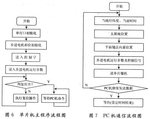 任意時(shí)刻太陽(yáng)的位置可以用太陽(yáng)視位置精確表示。太陽(yáng)視位置用太陽(yáng)高度角和太陽(yáng)方位角兩個(gè)角度作為坐標(biāo)表示。太陽(yáng)高度角指從太陽(yáng)中心直射到當(dāng)?shù)氐墓饩€與當(dāng)?shù)厮矫娴膴A角。太陽(yáng)方位角即太陽(yáng)所在的方位,指太陽(yáng)光線在地平面上的投影與當(dāng)?shù)刈游缇€的夾角,可近似地看作是豎立在地面上的直線在陽(yáng)光下的陰影與正南方的夾角。系統(tǒng)采用水平方位步進(jìn)電機(jī)和俯仰方向步進(jìn)電機(jī)來(lái)追蹤太陽(yáng)的方位角和高度角,從而可以實(shí)時(shí)精確追蹤太陽(yáng)的位置。上位機(jī)負(fù)責(zé)任意時(shí)刻太陽(yáng)高度角和方位角的計(jì)算,并運(yùn)用軟件計(jì)算出當(dāng)前狀況下俯仰與水平方向的步進(jìn)電動(dòng)機(jī)運(yùn)行的步數(shù),將數(shù)據(jù)送給跟蹤系統(tǒng)驅(qū)動(dòng)器,單片機(jī)接收上位機(jī)送來(lái)的數(shù)據(jù),驅(qū)動(dòng)步進(jìn)電機(jī)的運(yùn)行。系統(tǒng)具有實(shí)現(xiàn)復(fù)位、水平方位的調(diào)整,俯仰方向的調(diào)整,太陽(yáng)的跟蹤及手動(dòng)校準(zhǔn)等功能。[page]
