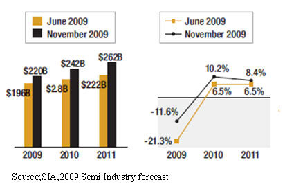 然而最新的預測調整為2009年全球半導體業僅下降11.6%,為2197億美元,但是對于2010年修正為增長10.2%,達2421億美元,及2011年增長8.4%,達2623億美元。