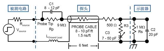 我們可以在探頭中增加一個(gè)和示波器輸入阻抗相串聯(lián)的阻抗,用這種辦法就可以減小探頭的負(fù)載效應(yīng)。然而,這就意味著輸入電壓不能完全加到示波器的輸入端,因?yàn)槲覀儸F(xiàn)在已經(jīng)引入了一個(gè)電阻分壓結(jié)構(gòu)。