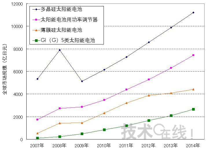 - 多晶硅太陽能電池的市場規(guī)模在2008年快速增長至7888億日元