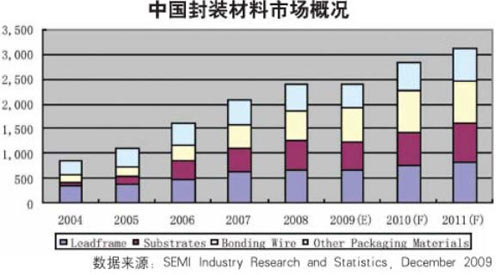 - 中國的半導體封裝材料市場在2009年將超過22億美元,比2008年增加1%左右