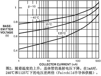 熱與冷都會對電路造成負(fù)面影響。在極高溫下,芯片可能燒毀(圖1)。更常見的情況是,如果你的設(shè)計(jì)達(dá)到未曾預(yù)料的溫度,很多部件都可能超出規(guī)定極限。當(dāng)出現(xiàn)這種情況時(shí),電路就可能表現(xiàn)出難以預(yù)料的行為。另外一個(gè)情況也同樣值得關(guān)注,即電路溫度從熱到冷,然后又從冷到熱。這種狀況會造成熱沖擊,也會毀壞元件。很多工程師并不關(guān)心自己的電路在低溫下的性能,但這種忽視是一個(gè)錯誤。半導(dǎo)體器件的性能在低溫下會發(fā)生顯著變化。雙極晶體管的基射結(jié)電壓在低溫下會大大升高(圖2和參考文獻(xiàn)1)。AnalogDevices產(chǎn)品開發(fā)工程經(jīng)理FranciscoSantos說:“如果你要設(shè)計(jì)一個(gè)能夠在負(fù)溫度下工作于1.8V的放大器,就要考慮當(dāng)從室溫降到-40℃時(shí),VBE(基射電壓)會增加130mV。這種情況將迫使設(shè)計(jì)者采用一組完全不同的放大器架構(gòu)。”