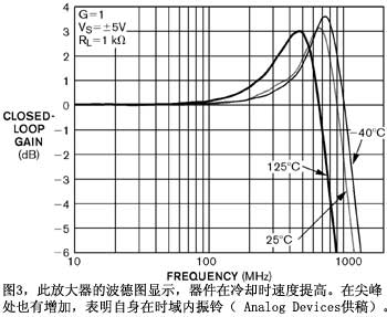很多放大器,如AnalogDevices的AD8045,在冷卻時(shí)會加速(圖3),而有些放大器(如AD8099)則在變冷時(shí)會降速。已退休的LinearTechnology信號處理產(chǎn)品前副總裁兼總經(jīng)理BillGross稱:“雙極晶體管在低溫下遇到的多數(shù)麻煩是低電壓工作。”他認(rèn)為,較高的基射電壓和較小的電流增益都更難于滿足規(guī)格要求。他說:“較低的輸入阻抗和b(電流增益)的不匹配都會造成低溫下的大問題。尤其是當(dāng)它們?yōu)槭覝剡\(yùn)行作了調(diào)整時(shí)。較高的gm(跨導(dǎo))很容易通過改變工作電流而得到補(bǔ)償,但這樣的話轉(zhuǎn)換速率就會變化。”