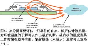 電路的熱分析分三個(gè)步驟。首先估計(jì)IC中產(chǎn)生的熱量。然后,估計(jì)電路板或散熱片散掉的熱量。最后,估計(jì)部件將要運(yùn)行的環(huán)境溫度(圖4)。在估計(jì)元件產(chǎn)生的熱量時(shí),DC分析通常沒什么價(jià)值。一只電壓為1V、流過1A電流的電阻器,會產(chǎn)生1W的熱量。但是,要估計(jì)交流或未確定的信號所產(chǎn)生的熱量就比較麻煩。首先,從電源端到接地腳的靜態(tài)電流總是在耗散一個(gè)直流功率。一個(gè)采用10V電源和5mA靜態(tài)