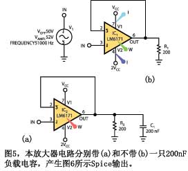 如果你能確定IC通過信號的特性,就可以用Spice來估算功耗。此時(shí)必須保證使用恰當(dāng)?shù)腟pice模型,它們對一些測試信號給出合理的結(jié)果,而功耗計(jì)算此時(shí)沒有價(jià)值。圖5表示一個(gè)Spice圖。芯片的功耗不同于到達(dá)負(fù)載的功率。圖6是圖5示意圖的Spice曲線圖。它以紅線表示啟動的振蕩。電路是否會發(fā)生這種振蕩只是個(gè)人的猜測,但它應(yīng)該會使你在建立原型后查看這種行為。記住,在OrcadCapture上點(diǎn)擊W鍵只能顯示芯片的靜態(tài)功耗。要獲得工作時(shí)的功耗,要用示意圖上的功率標(biāo)記,然后用曲線程序的rms-math函數(shù),給出器件的平均功耗。