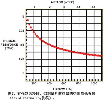 對流散熱也有一些困難。例如,氣流對商用散熱片的影響(圖7)。注意,在高溫下,熱阻會增加五倍。使用強(qiáng)制風(fēng)冷的散熱片有較薄、間距更近的鰭片,比如一款風(fēng)扇式CPU冷卻器。如果你的產(chǎn)品沒有風(fēng)扇,則IC產(chǎn)生的熱量會傳導(dǎo)和散播出來,然后傳送到機(jī)內(nèi)的空氣中。接下來,隨著整個(gè)機(jī)器溫度的上升,熱量通過對流傳送給周圍的空氣,如果你把機(jī)器放在腿上,則部分熱量也會傳導(dǎo)過來。外殼材料的熱阻就變得很重要。熱量從內(nèi)向外的傳送速度,塑料殼要慢于金屬殼。