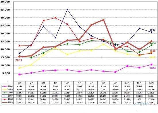圖2:2005-2009年各月美國(guó)混合動(dòng)力汽車銷量