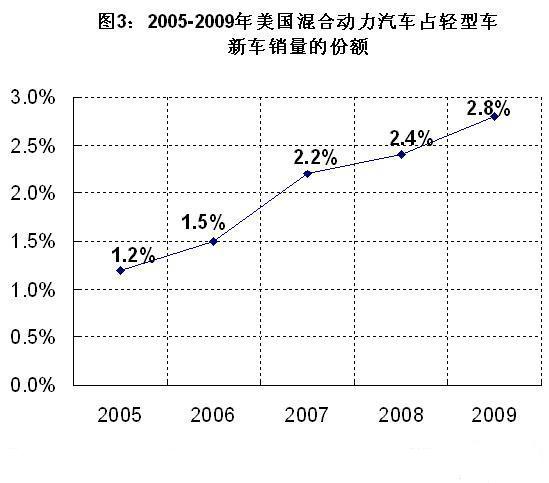 • 混合動(dòng)力汽車銷量中的份額從2005年的1.2%逐漸上升至2009年的2.8%