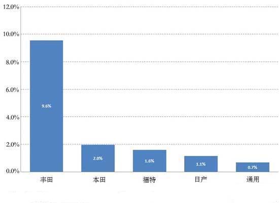 圖4:2009年12月車企在美國(guó)的混合動(dòng)力汽車銷量占輕型汽車新車總銷量的比重