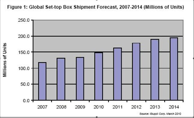 據(jù)iSuppli公司,機(jī)頂盒出貨量未來幾年將繼續(xù)增長。消費(fèi)者收看模式發(fā)生轉(zhuǎn)變,通過互聯(lián)網(wǎng)提供的電視內(nèi)容越來越流行,從而將為提供商創(chuàng)造條件,在數(shù)字家庭的激烈爭奪中獲得新的營業(yè)收入來源。