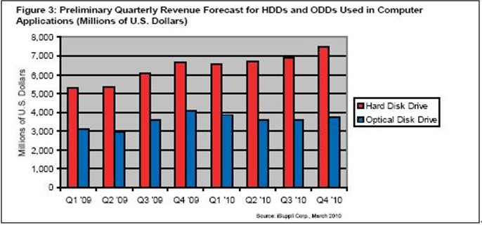 據iSuppli公司,繼2009年下滑之后,預計2010年用于電腦的硬盤(HDD)和光驅(ODD)全球營業收入將增長,因為PC出貨量將隨著全球經濟復蘇而上升。