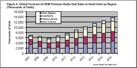 北美是車用高端音響系統(tǒng)的最大市場(chǎng)。該地區(qū)OEM高端音響單位出貨量預(yù)計(jì)到2016年將增長(zhǎng)到460萬(wàn)套,而2007年是330萬(wàn)。