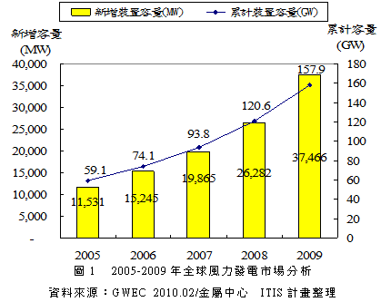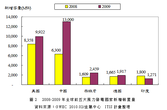 2009年全球風力發電市場不畏金融海嘯沖擊,在美國及中國政府大力推廣下,新增風力發電裝置量仍較2008年成長31%。但因2009年新增容量主要來自既有存貨,風力機接訂單量僅為15,717MW,較2008年衰退41%。前瞻2010年,在中、美及歐洲風電大國帶動下,全球風力發電新增容量將較2009年成長15%;而風力機接單量受到價格驟降及主要風電大國景氣回升影響,可望庫存回補而為2009年的2.2倍。
