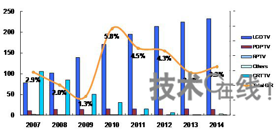 按顯示元件劃分的電視市場規(guī)模展望(2010年以后為預(yù)測值,單位為100萬臺)