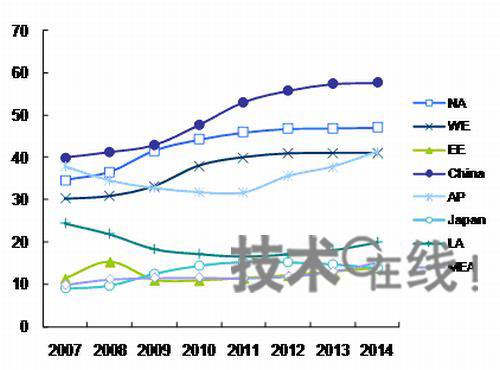 按地區(qū)劃分的電視總供貨量展望(2010年以后為預(yù)測值,單位為100萬臺)