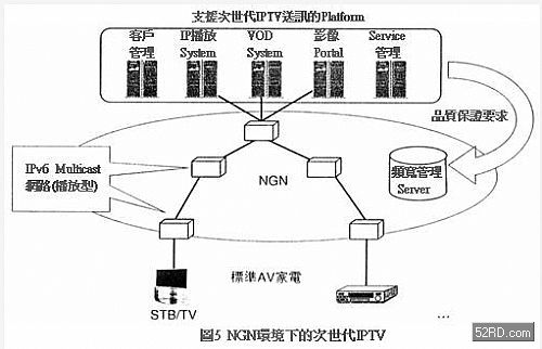 實現次世代IPTV服務必需與可作QoS控制的次世代網路(NGN)整合。如圖5所示NGN與次世代IPTV系統整合,藉此建立次世代IPTV全新服務的要件。